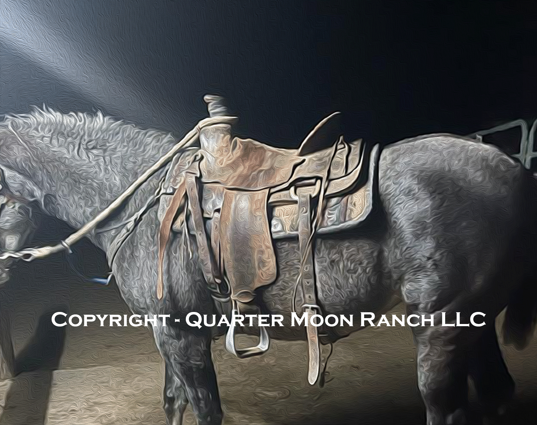 An oil like rendering of a photograph taken at night of a horse in western tack. The file is in JPG format, 1737 x 1376 pixels, 1.65MB and 200 dpi. Prints are for personal use only. They may not be used for commercial purposes without consent of the artist.