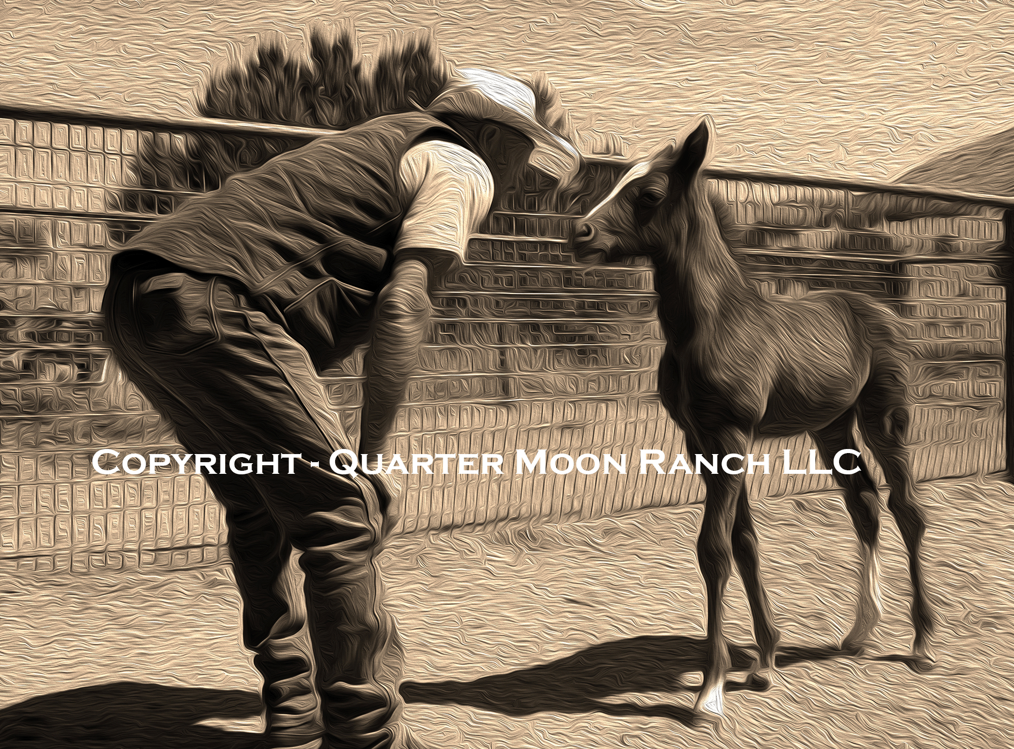 An oil like rendering of a photograph taken a man speaking to a foal. The file is in JPG format, 2000 x 1478 pixels, 3.21 MB and 72 dpi. Prints are for personal use only. They may not be used for commercial purposes without consent of the artist.